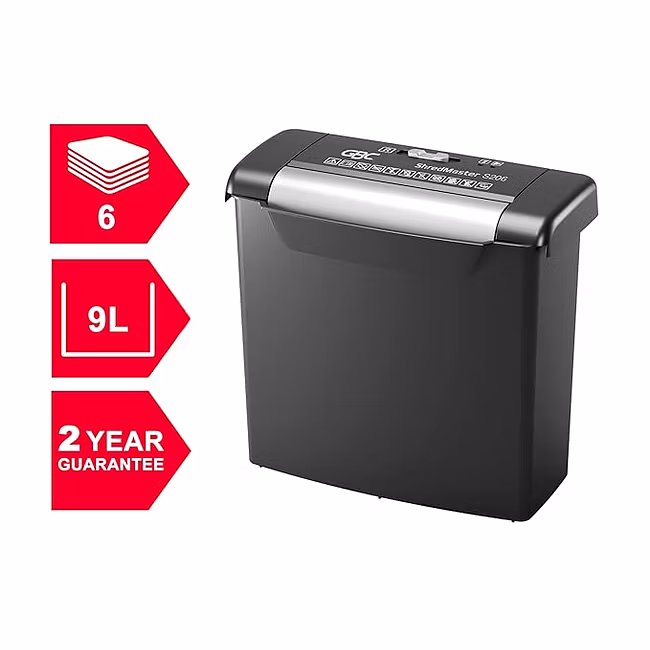 GBC Shredmaster S206 is a straight-cut paper shredder designed for light home or personal use. It shreds documents into 6mm strips, has a P-2 security level, and can handle a maximum of 7 sheets of paper per pass. It features a 9-liter bin that holds up to 45 sheets, and has an easy lift-off head for emptying. The machine weighs 1.75kg.